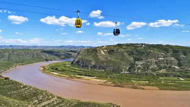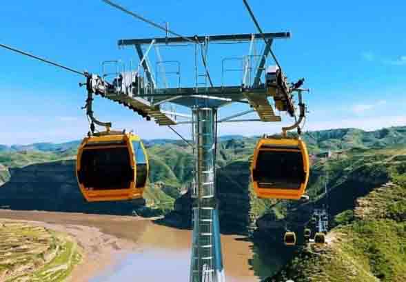 陜西延川乾坤灣駿景索道有限公司由陜旅集團旗下陜西駿景索道投資建設有限公司及延川縣文化旅游(集團)有限責任公司投資建設,公司于2016年9月注冊成立,2017年6月開始施工建設,2018年7月投入運營。索道總投資約1.174億元。索道線路為清水灣至會峰寨,驅動站位于清水灣景區入口處山峰南側,迂回站位于會峰寨景區入口北側。索道型式為單線循環脫掛抱索器8人吊廂式索道,含29個8人吊箱,10個底面純透明玻璃4人吊箱,沿途共設有8個支架,線路全長1900米,上下站落差15米。索道建成后運行速度可達到6米/秒,從清水灣乘坐索道到達會峰寨只需7分鐘,單項運量可實現1500人/小時。